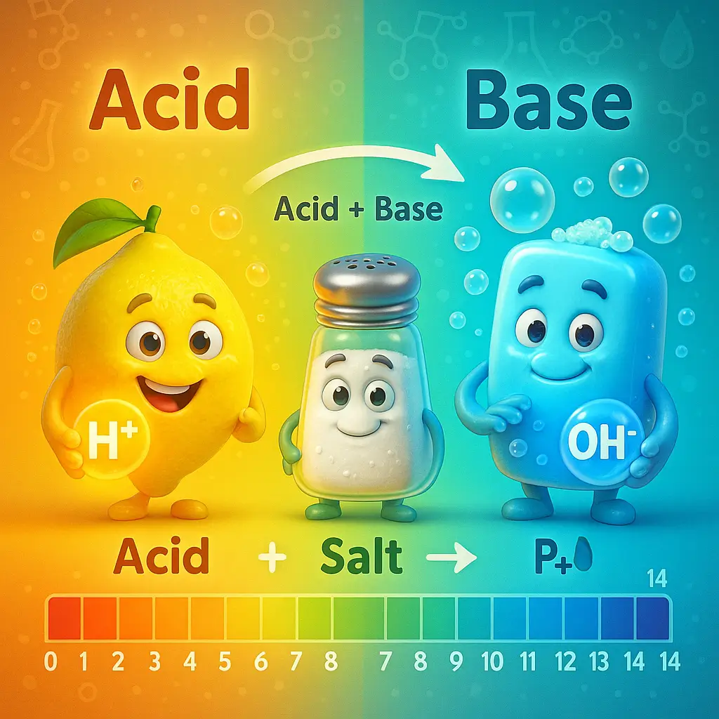 Acids donate hydrogen ions (H+) and have pH < 7 (sour taste, like lemon juice) Bases accept hydrogen ions or release OH- ions and have pH > 7 (bitter taste, slippery feel, like soap)