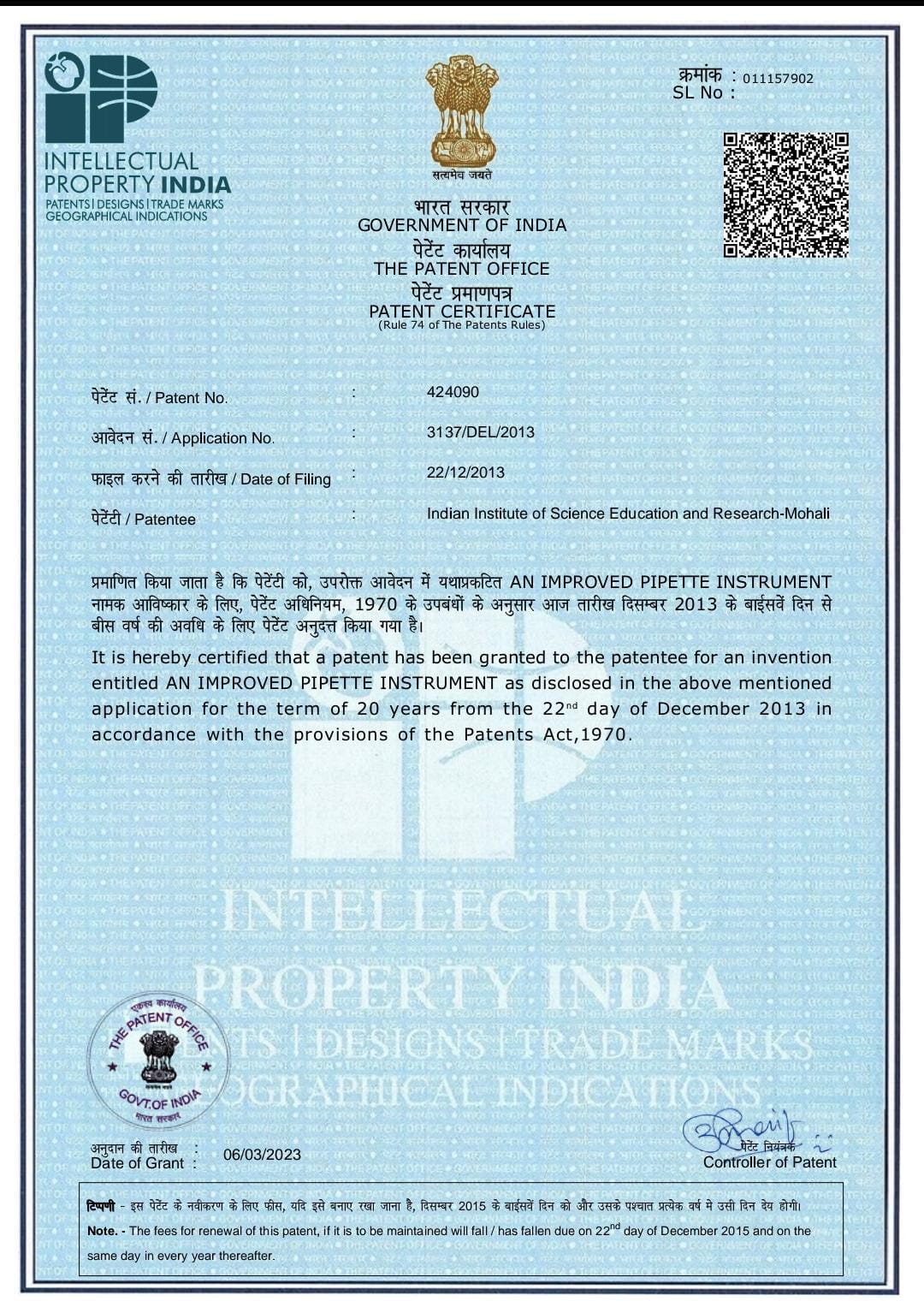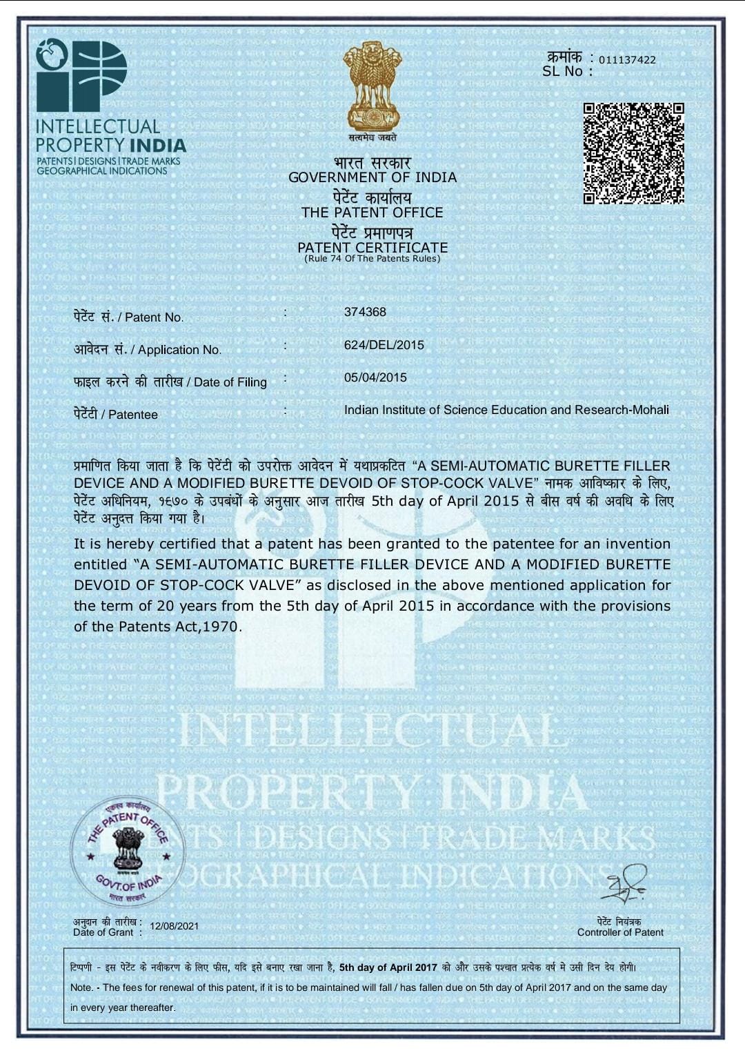- Indian Patent (3137/DEL/2013) for Semi-Automatic Pipette Filler