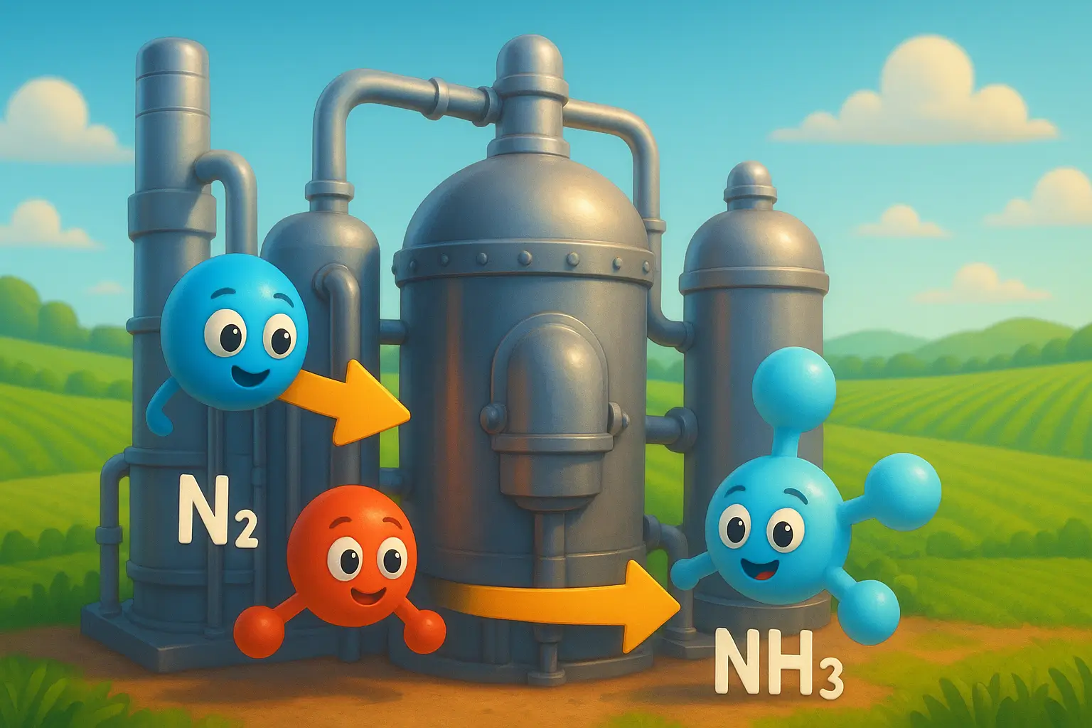 What is the Haber-Bosch process? The Haber-Bosch process is the industrial method for synthesizing ammonia (NH₃) from nitrogen and hydrogen gases at high pressure (150-300 atm) and moderate temperature (400-500°C) using an iron catalyst. This process produces over 185 million tons of ammonia annually, enabling fertilizer production that feeds approximately 48% of the global population.